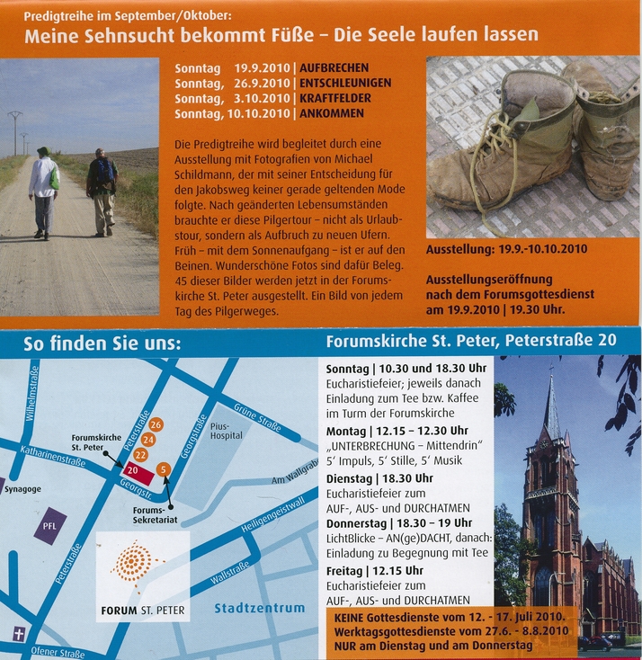 die foto-ausstellung begleitet eine predigtreihe zum thema pilgern in der forumskirche st. peter (bei der nwz) in oldenburg. die eröffnung ist am sonntag, den 19.09.2010 um 19.30 uhr, nach dem forumsgottesdienst. zum ausstellungsflyer